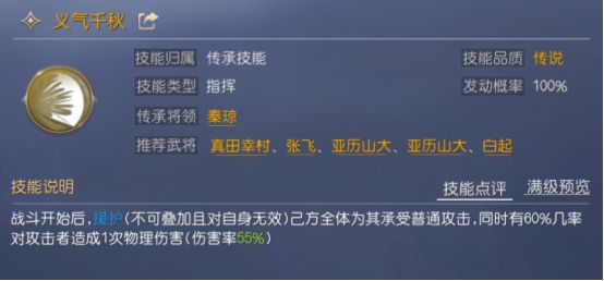 白起一技能推荐义气千秋,作为前排将领,需要搭配守护技能。白起虽为前排,但输出能力也不弱,义气千秋为队友承伤并且反击,在技能较少时,不失为不错的选择。如果有更好的技能可以搭配,可直接替换,替换时需要考虑技能搭配的联动效果。