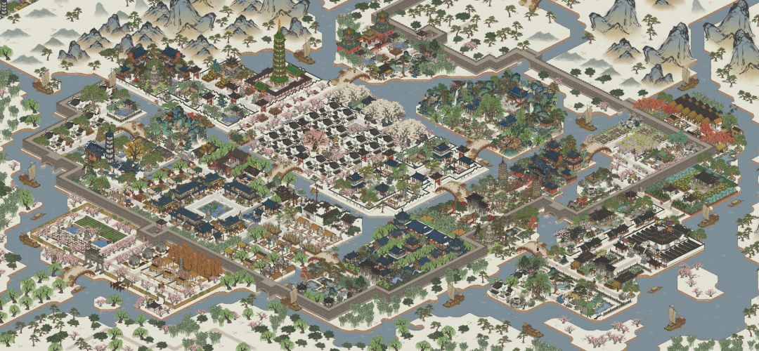 七,这是新扩建的区域,图一,是江南贡院,我的思路是,对称,加庄严,我买了两个狮子放在门口,特别威武庄严,水月庭院+杏花酒家+藕花深处,构建一处郊外别院!非常有意境!图二,是花园,各种花园,让你迷失在花的海洋中,后边仓库区加上漆器工坊整齐布局,也很舒心!