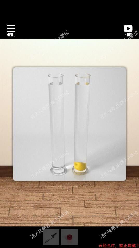 7.点击两个玻璃管,用装满水的塑料瓶给两个玻璃管各注水3次,获得苹果和带孔的金属板。7.1、7.2、7.3、7.4