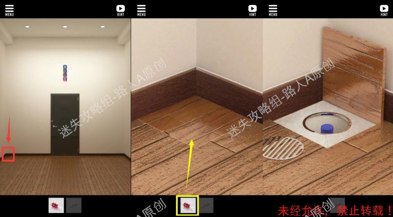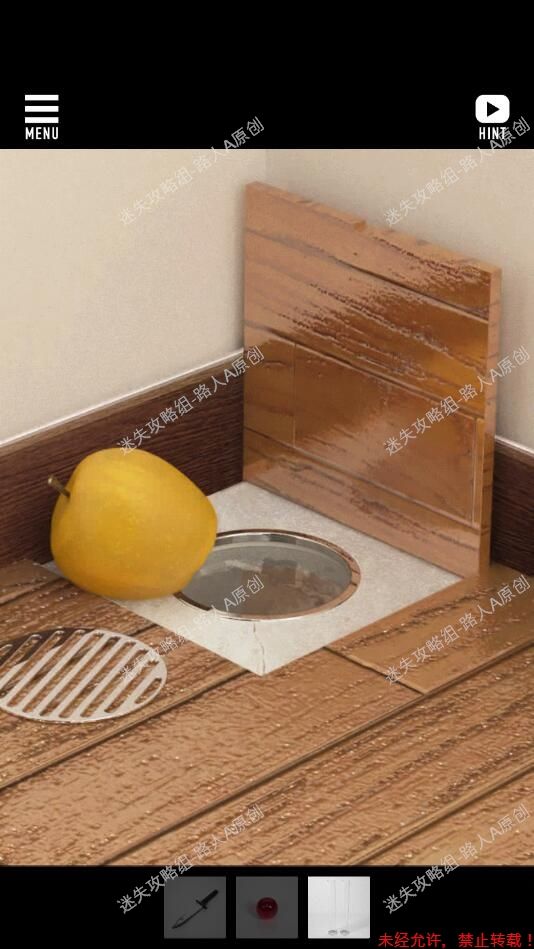 5.点击门左边的角落,用螺丝刀撬开地板和排水口,获得塑料瓶。5.1、5.2、5.3