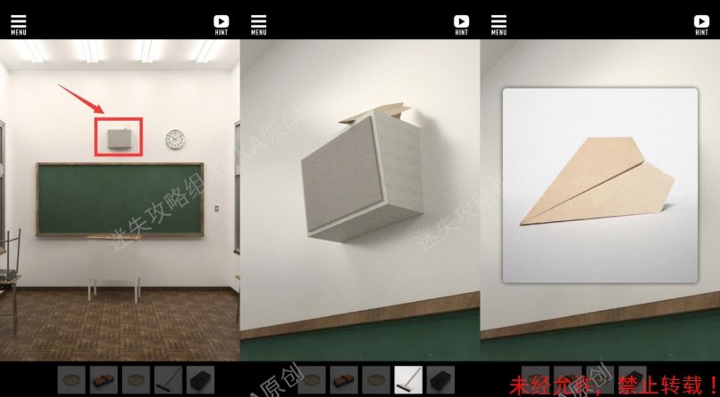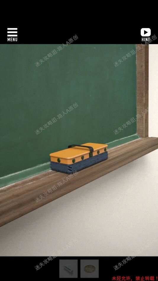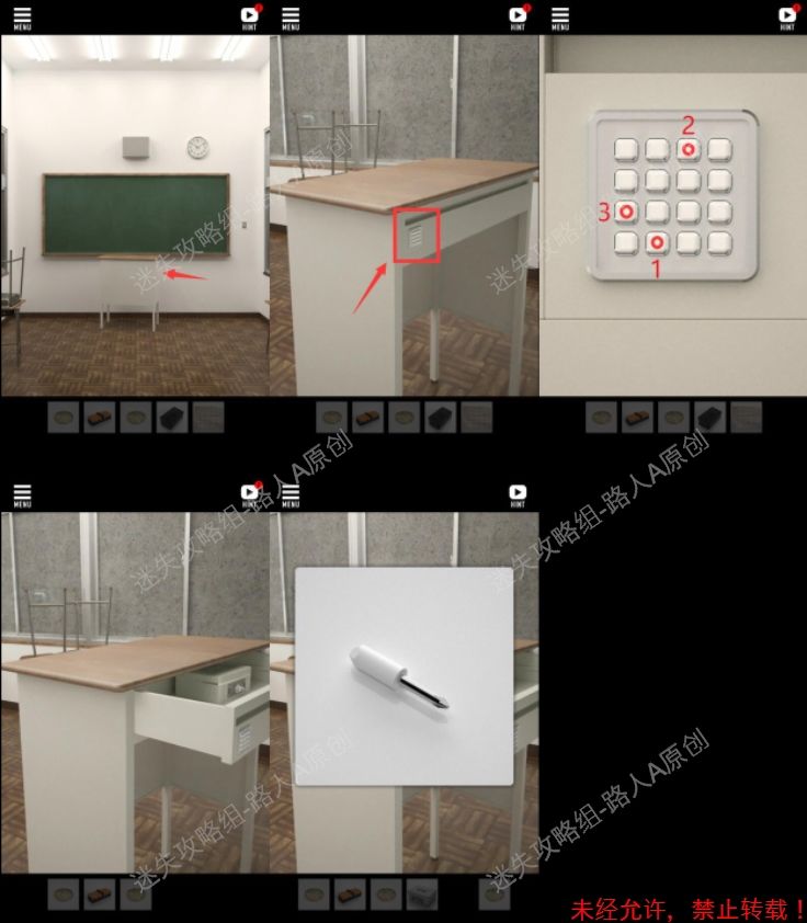 9.开灯,点击讲台,点击讲台背面的密码盘,对照纸飞机,按顺序按下【IN THE SEA】对应的位置,打开讲台抽屉,获得保险箱、硬币以及粉笔,拧开粉笔,发现其实是螺丝刀。9.1、9.2、9.3、9.4、9.5