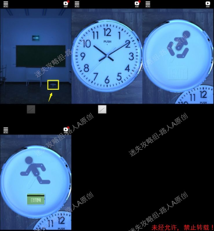 19.返回黑板,点击掉落的挂钟,注意PUSH下有个小孔,使用笔芯拆下钟盘,拆开后,注意下方的【EXIT】字样,按照紧急出口标志的样子调整小人,获得钥匙卡。19.1、19.2、19.3、19.4