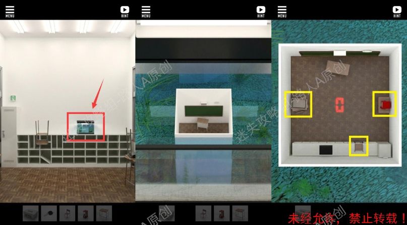 12.点击鱼缸,用钥匙打开鱼缸盖子,点击里面的教室模型,把从扭蛋获得的模型放入对应位置,扭蛋机放右边桌子上,椅子放下边架子上,桌子放左边桌子上。12.1、12.2、12.3