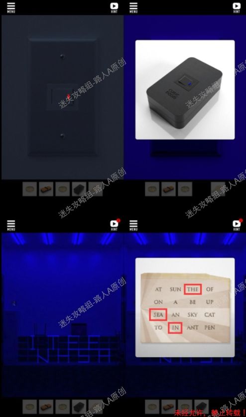 8.关灯,然后打开黑色开关。架子出现【IN THE SEA】,在纸飞机上找到单词,记下单词位置。8.1、8.2、8.3、8.4