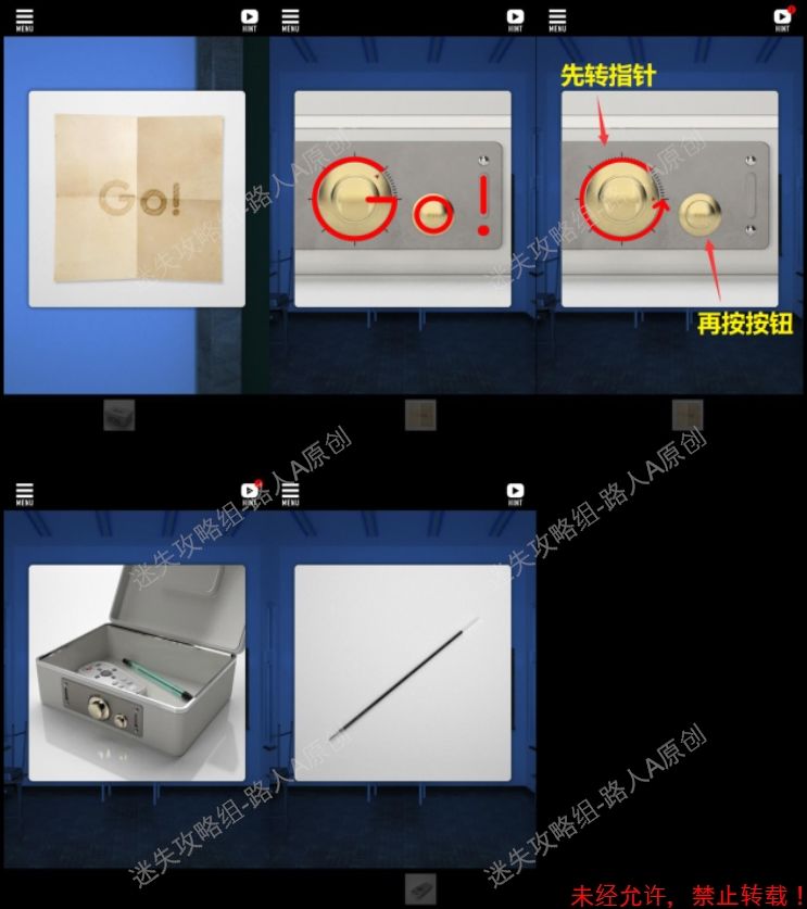 16.打开纸张,上面写着【Go!】。这其实对应的是保险箱,如图操作,获得遥控器和圆珠笔,取下圆珠笔的笔芯。16.1、16.2、16.3、16.4、16.5