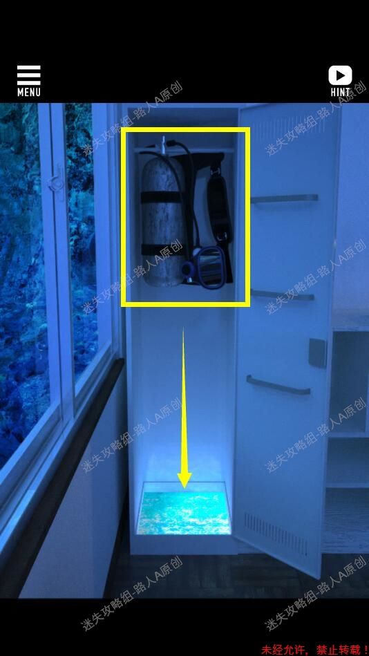 20.点击紧急出口标志下边的储物柜,用钥匙卡打开储物柜,取得潜水装备,然后使用潜水装备进入水中,一直往上划,游上水面,成功逃脱。20.1、20.2