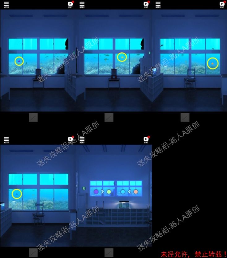 18.按照投影提示,分别查看左右两侧的窗户,左侧窗户是紫色小鱼变为黄色,右侧窗户是橙色小鱼变为蓝色。返回投影窗户,调整颜色。18.1、18.2、18.3、18.4、18.5