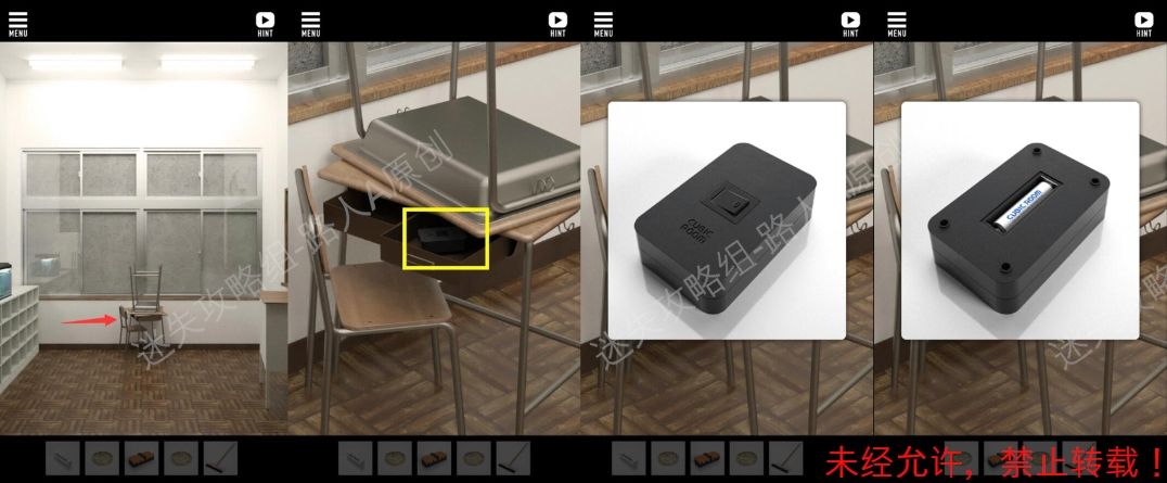 6.点击窗户边的椅子和桌子,移开椅子,从抽屉里获得黑色开关,然后放入电池。6.1、6.2、6.3、6.4