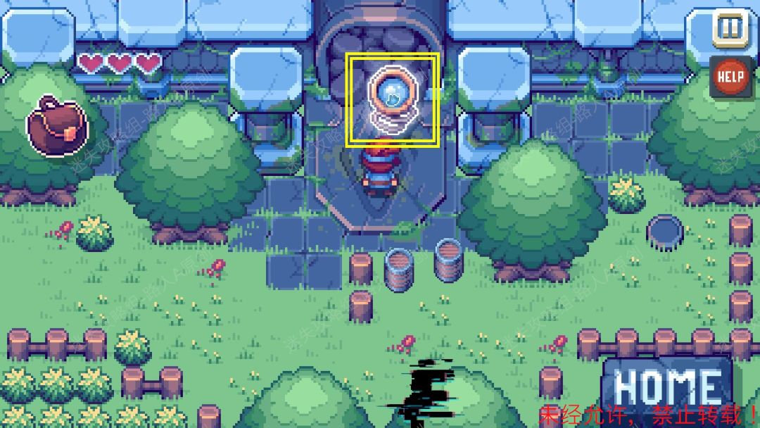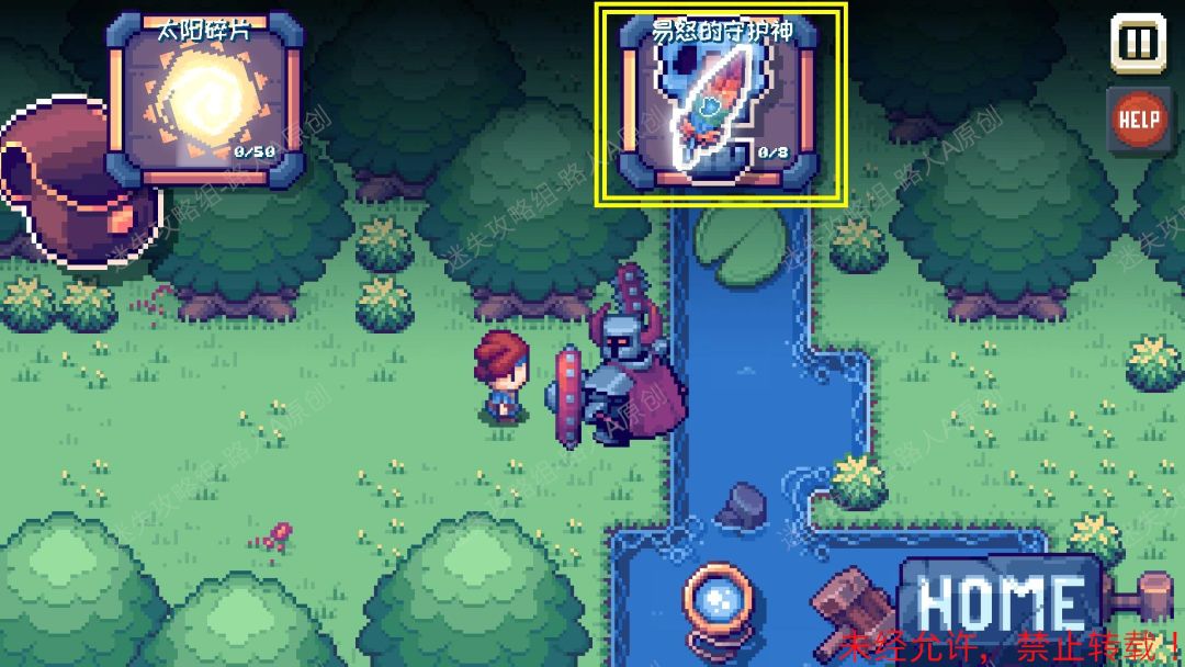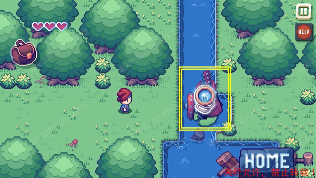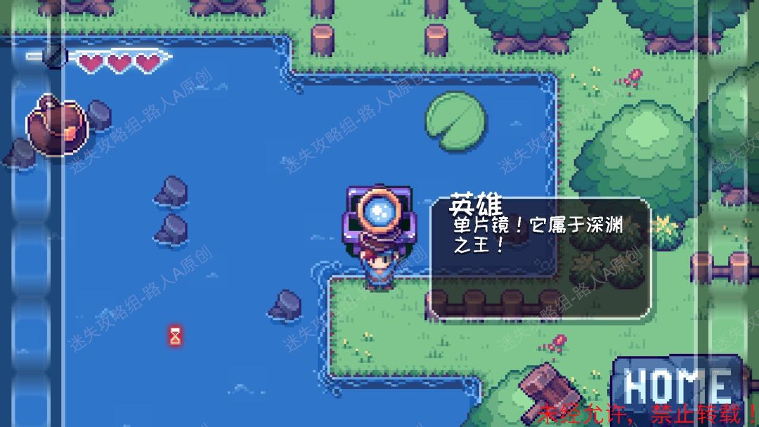 65.用单镜片把睡莲变大,护卫站上睡莲后,用单镜片把护卫变大,然后摔落HOME,使护卫沉入河流。再次用单镜片放大睡莲,英雄通过河流到对岸。65.1