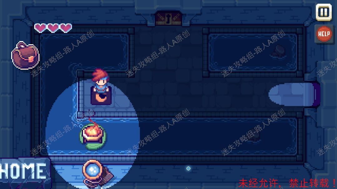69.在画面左侧摔落HOME,使睡莲移到最右,用单镜片放大睡莲上的火盆,然后通过摔落HOME,把睡莲往左移,引导英雄跟随火光往左移,踩上月亮石板。之后再用同样的方法,引导英雄往右移,回到右边的房间。69.1