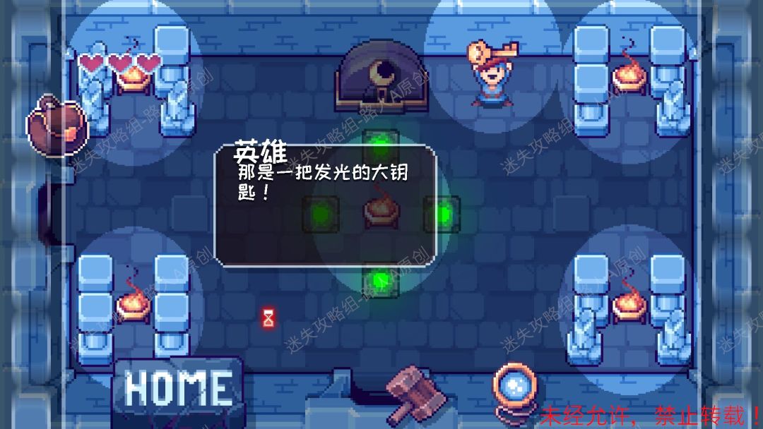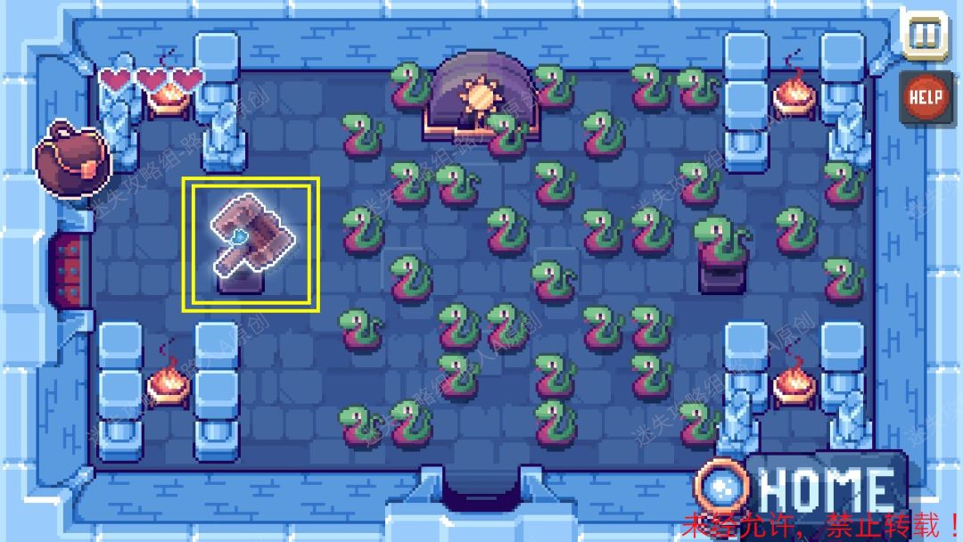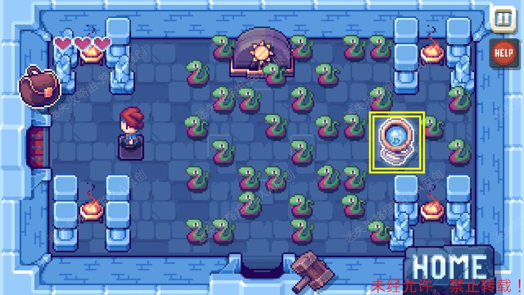 67.摔落HOME,直到有蛇掉落在石板上。用单镜片把石板上的蛇变大,用锤子缩小英雄,然后再次摔落HOME,开启门。67.1、67.2