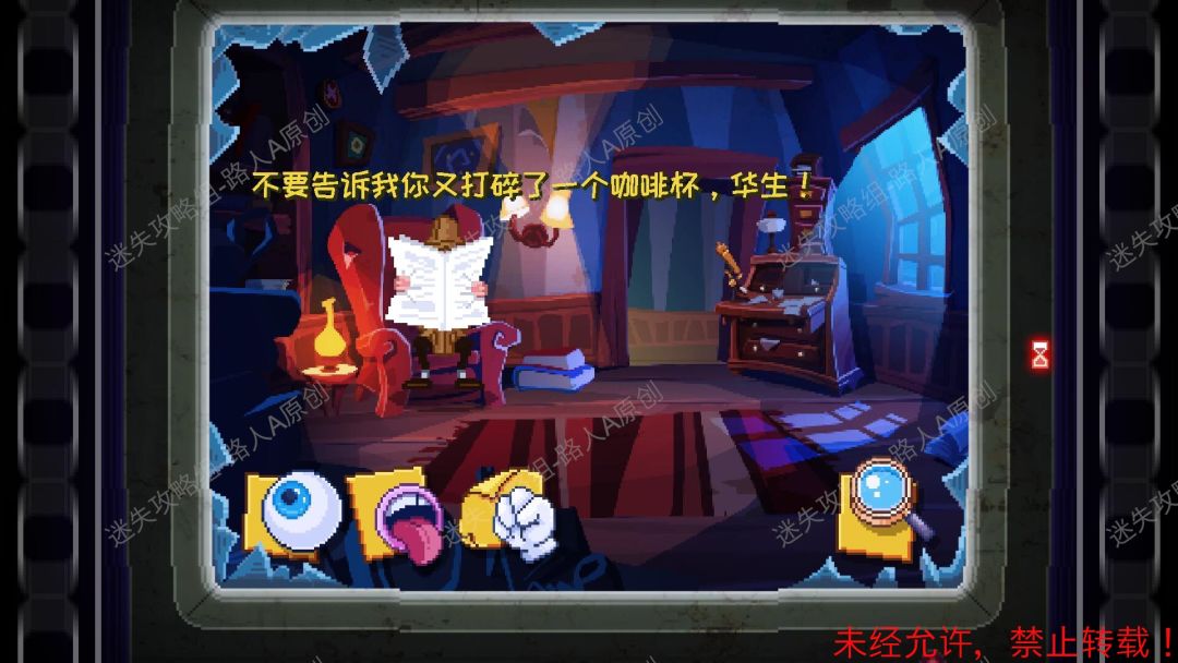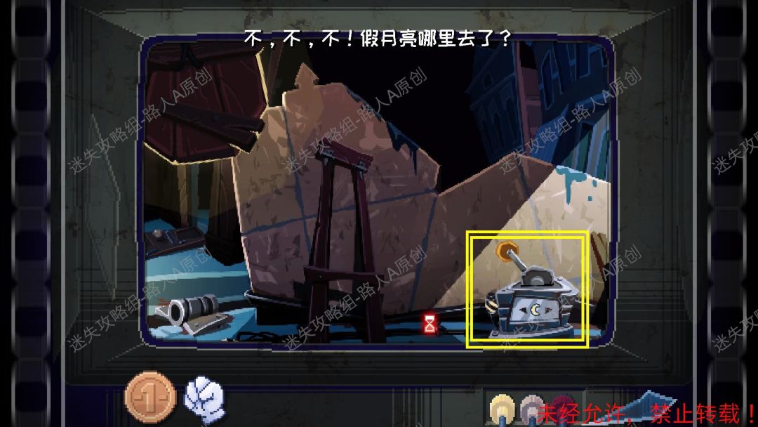 39.返回右边的房间,剧情对话过后,离开房间,转到电视机背面,拉下月亮装置的拉杆,使房间里的月亮移出来,再进入右边的房间,福尔摩斯会走到房间门口。然后再次拉下月亮装置的拉杆,使月亮移回房间里。