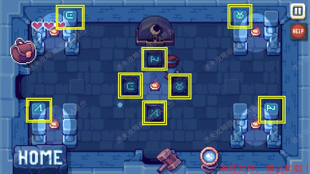 70.用锤子缩小四个角的火盆,可以看到各自对应的符号,同时注意四个角的柱子,完好的柱子数量代表顺序。用锤子缩小中央的火盆,可以看到4个石板的符号。石板的符号对应柱子的符号,由此可以得知石板顺序:左上右下。让英雄按照左上右下的顺序“踩”石板。(当英雄站上石板时,摔落HOME可以使英雄“踩”石板,石板亮绿。)70.1、70.2