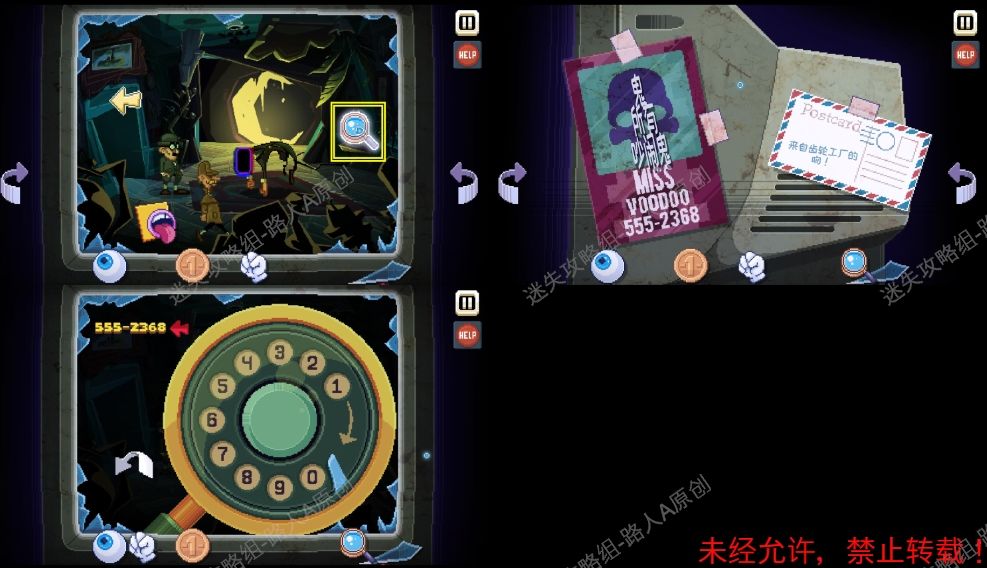 40.返回右边的房间,用放大镜查看桌子上的电话,用电话拨打电视机侧面的电话号码:555-2368。40.1、40.2、40.3