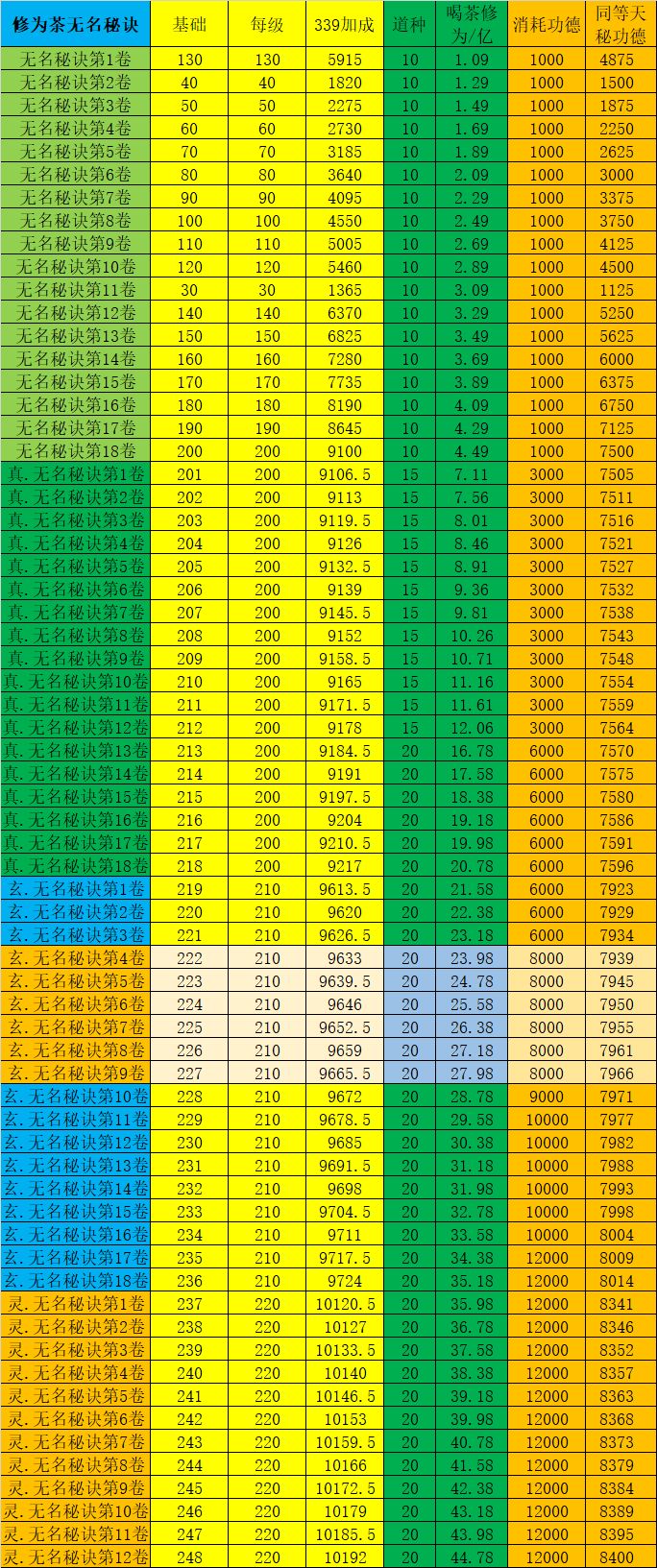 1,修正了灵无名,玄无名,真无名秘诀的升级属性,根据林冲道友的数据,真无名基础属性为201-218,升级属性为200,玄无名的基础属性为219-236,升级属性为210,灵无名(推测)基础属性为237-254,升级属性为220。链接如下