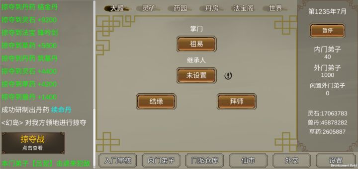 保守走丹鼎,前期在不可以炼丹之前不要惹其他宗门,灵活使用外门弟子,有药材就多去炼丹,没药材就去采药,如果你有个不错的弟子,可以去欺负一下排面靠后的宗门,或者猥琐发育,就炼丹,聚灵丹和纳气丹使劲喂,喂出一个出窍就轻松了,接着就是去欺负没有出窍的宗门,抢药材,多弄几个出窍,然后就可以放下了,专心培养一个弟子,不管加成功率的丹药,就是加灵气的两个,走等级碾压,慢慢的你就发现你无敌了,就是抢资源喂自己,把其他宗门抢到一个出窍都没有。这个路线相对稳妥。