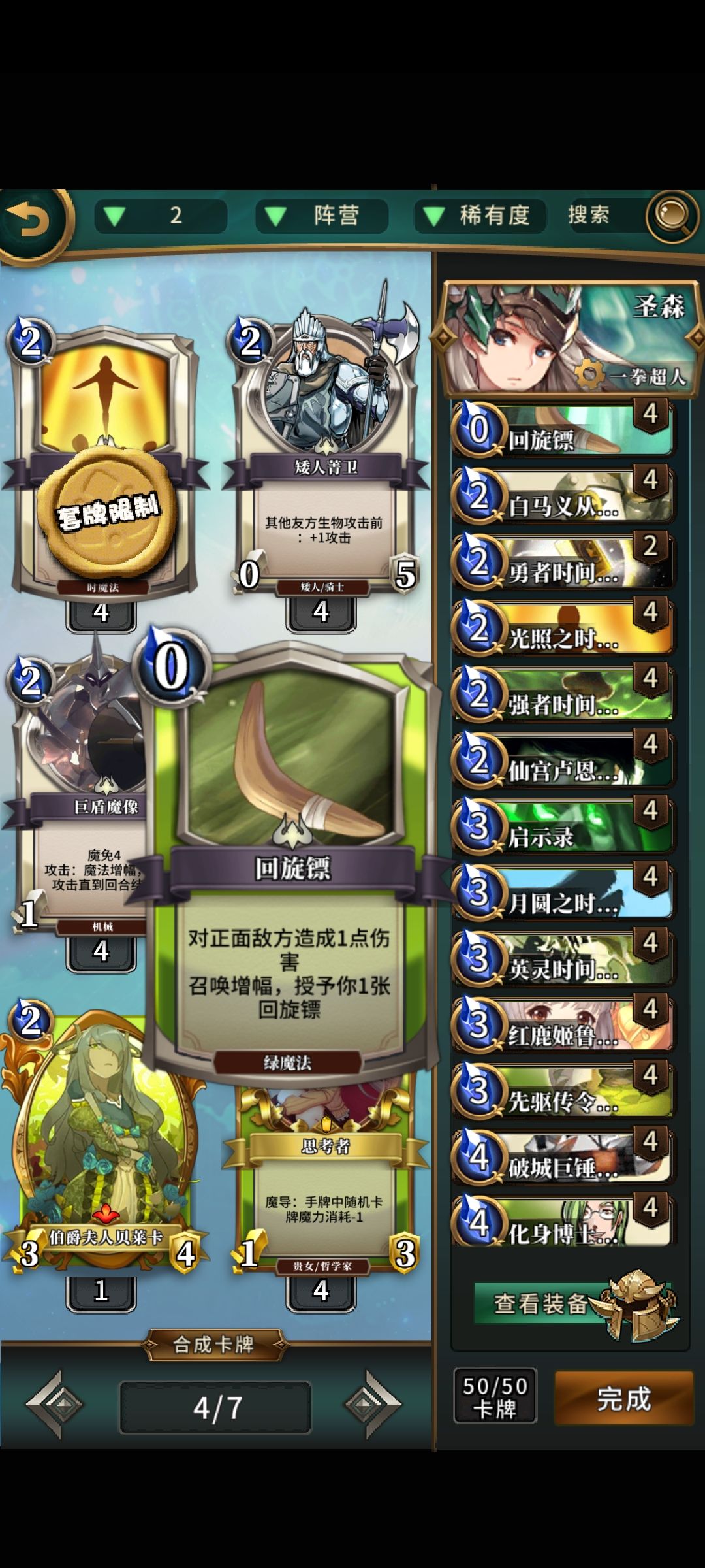 回旋镖,强力神卡,要注意的是它的召唤增幅,要先下怪才能手。0费能造成一点伤害降低对方生命下限,,调整自己生物位置的同时也是绿魔法,和博士高度契和,能快速增加博士身材。