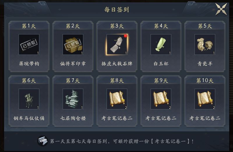 活动期间,主公们通过游戏主界面的【活】-【每日签到】,进入活动页面签到打卡,领取获取破损的文物及藏宝图。