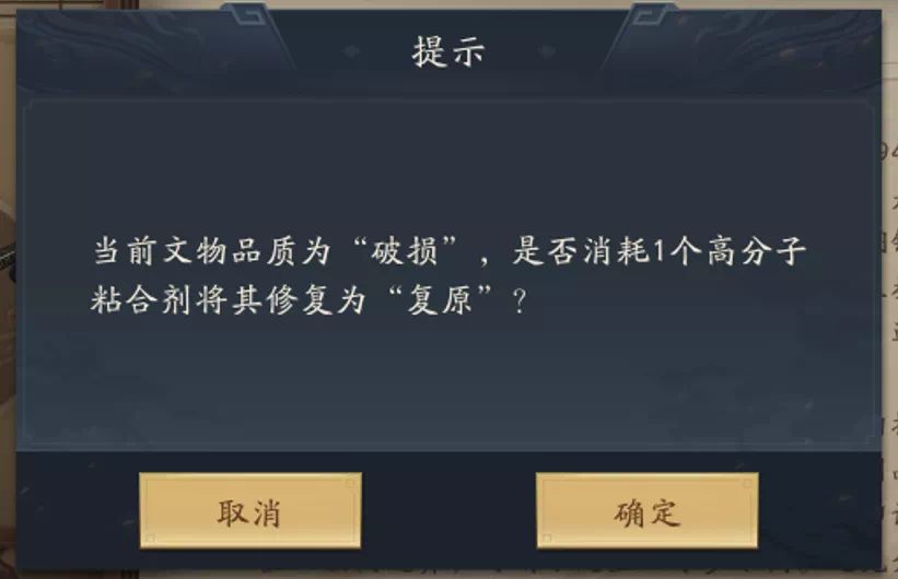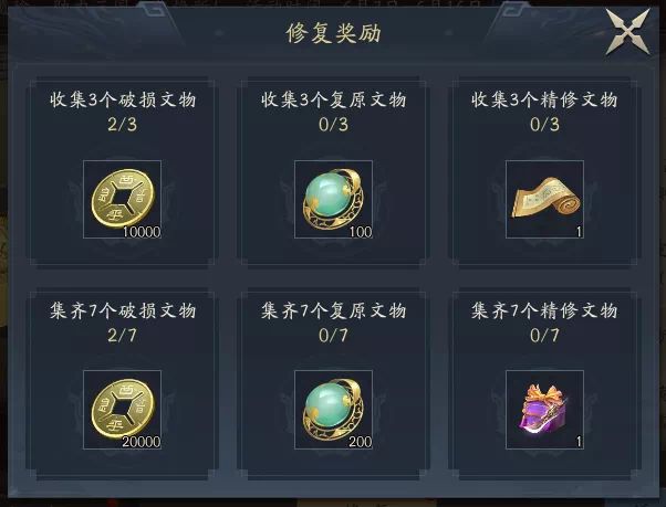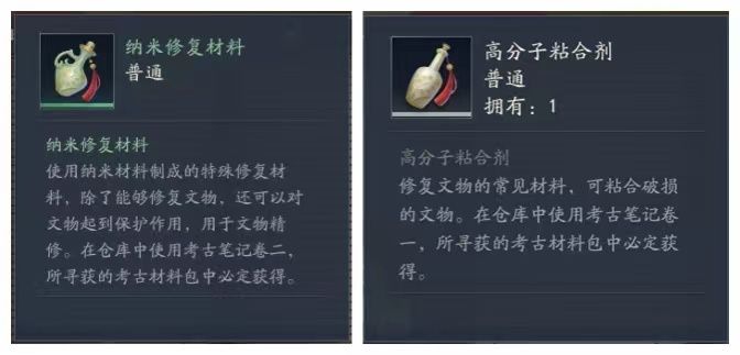 修复时,需消耗一定量的高分子粘合剂或纳米修复材料。当完成一定量的文物修复后,即可领取修复进度奖励。