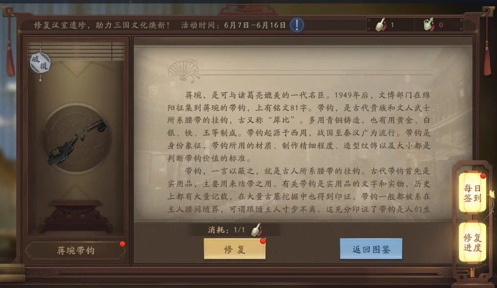 汉史遗珍是《鸿图之下》与成都武侯祠的联动活动,活动分为三部分:每日签到、收集修复道具及修复文物。