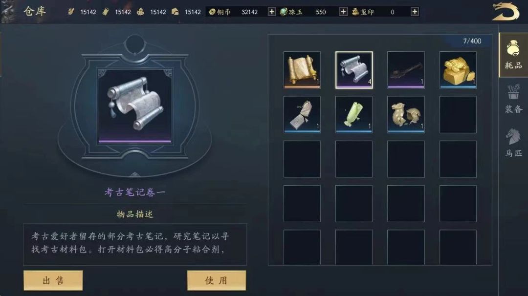 Tips:前往仓库,使用考古笔记道具,方可开启寻宝,获取修复道具。