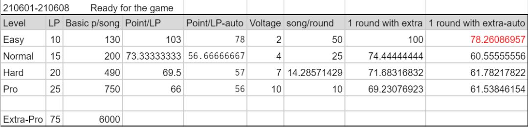 3. Point/LP: 三首曲子一个set list,如果全部手打且没有掉血的话,最后结算时会加上250*3 point的life bonus。以一个set list为单位,算出不同难度手打单倍的效率。比如对于hard模式来说就是 ((490+650)*3+250*3)/(20*3) = 69.5。