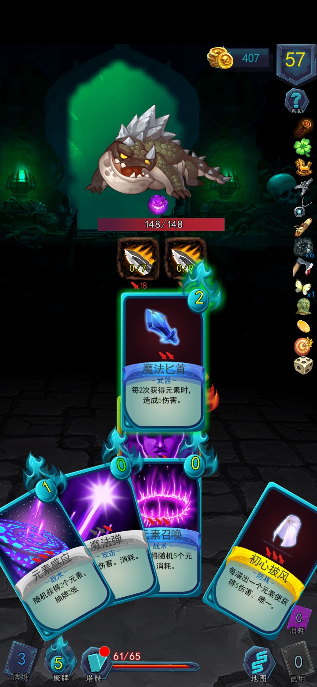 出牌思路起手直接上披风,元素感应加+元素护盾互相套娃堆甲,当敌方最低仇恨值上限≥5时,可以双感应再加护盾,当敌方最低仇恨值上限≥6的时候,可以直接披风+匕首更快的打出输出,只要不是对方拥有破甲或真实伤害的技能,无伤输出非常容易,轻松一刀999,或者轻松护甲上千,非常适合萌新前期套路。