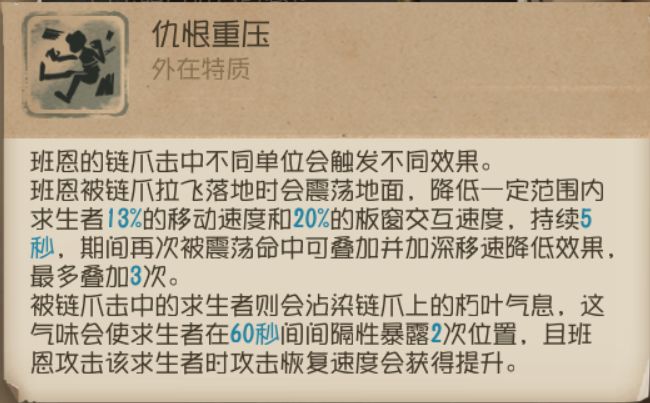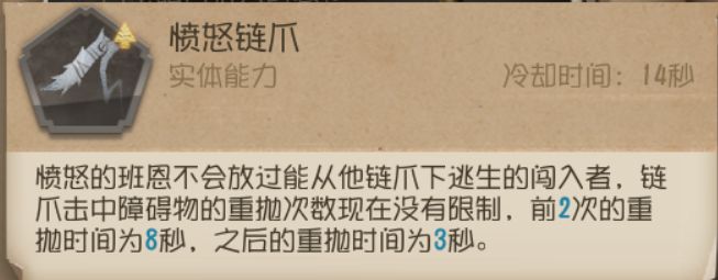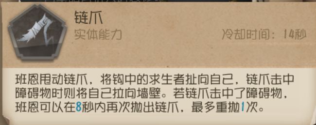★实战注意:此时链爪在击中求生者后,将对其造成普通攻击一半的伤害。因此可以先使用链爪击中求生者,但不立即进行普通攻击,这时求生者在受到链爪伤害的同时还会被减速。等待【链爪】技能冷却结束后,我们可以再一次击中求生者并立即进行普通攻击,将其迅速击倒。