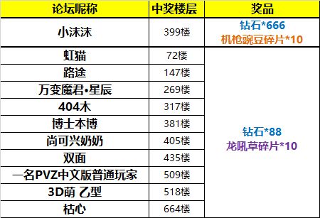 一等奖(1名):钻石*666,机枪豌豆碎片*10