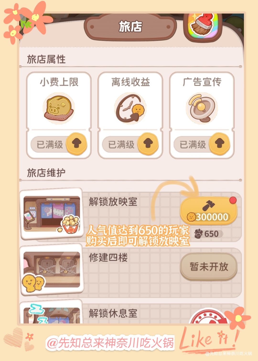 3.温馨提示:放映室设施中的“口碑收集罐”建议优先购买。后面会提到它的用处。