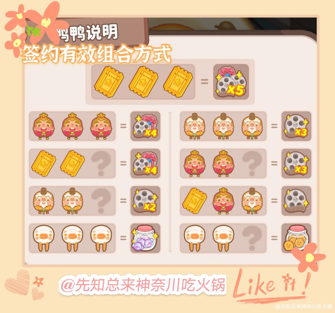 3.签约鸭的不同组合方式会得到不同的资源。具体如下图所示:(图中未排列出的组合即为签约失败)