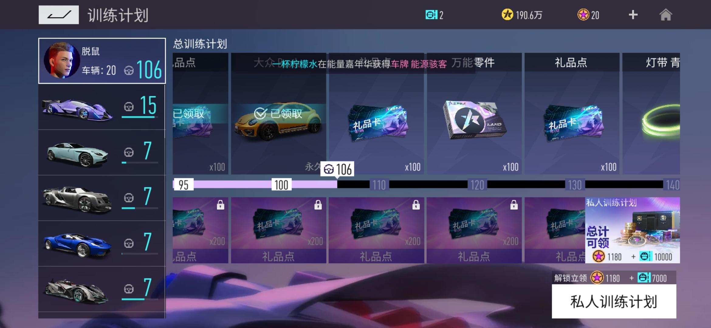 等级是所有车熟练度的和。因为总等级有很多奖励,所以建议每个车跑几把,升到三级还有一个卷。