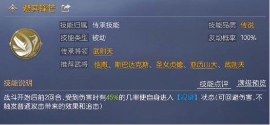 张飞技能一推荐避其锋芒。前三回合张飞处于被普攻攻击的状态,携带避其锋芒可使自身有几率进入规避状态,满级的避其锋芒更有90%的几率可免伤。本身普攻伤害就不高,高概率的免伤,让张飞可以承受更多的伤害。