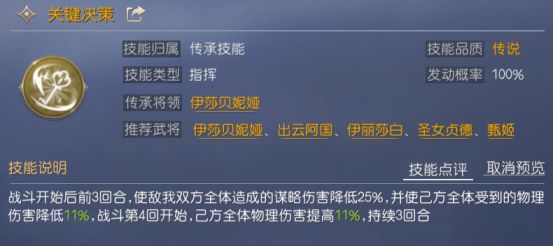 恺撒一技能推荐关键决策,前三回合降低敌我双方的谋略。因为我方输出都是物理伤害,所以选择该技能,以前三回合降低谋略伤害为代价,第四回合开始提高我方全体的物理伤害,这个牺牲很划算。