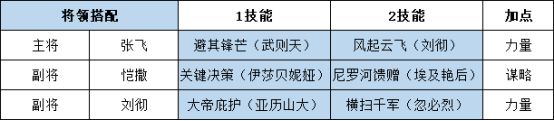 该阵容是规避流阵容,以张飞为前排顶住大量伤害。如果仅仅靠刘彻单输出核心,整个阵容的容错率不高。所以张飞携带一个输出恢复类技能提高容错。恺撒在该阵容中是真正的工具人,为整个团队提供保护和恢复。另外需要注意的一点是,张飞的骑兵需转成步兵,配合恺撒坚毅斗志提供的防御属性和规避状态,才能在前排受到更少的伤害,站的更久。