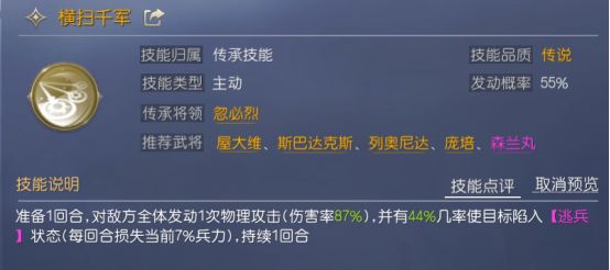 刘彻二技能推荐横扫千军,因为刘彻自带技能拥有附加效果,可以处于逃兵的目标再次发动攻击。横扫千军虽然有1回合的准备阶段,不过一旦触发对全体发起攻击,满级的横扫千军更有80%几率让目标陷入逃兵状态,配合刘彻的附加效果,可将伤害打满。