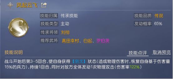 张飞二技能推荐风起云飞,前三回合张飞受到的伤害较低,所以选择风起云飞保证张飞3-5回合的状态。风起云飞使自身获得倒戈状态,所以张飞加点主加力量,造成的伤害变多,恢复的兵力也随之增加。在获得倒戈状态的同时,张飞还会对敌方全体发动攻击,力量加点可造成更多伤害。