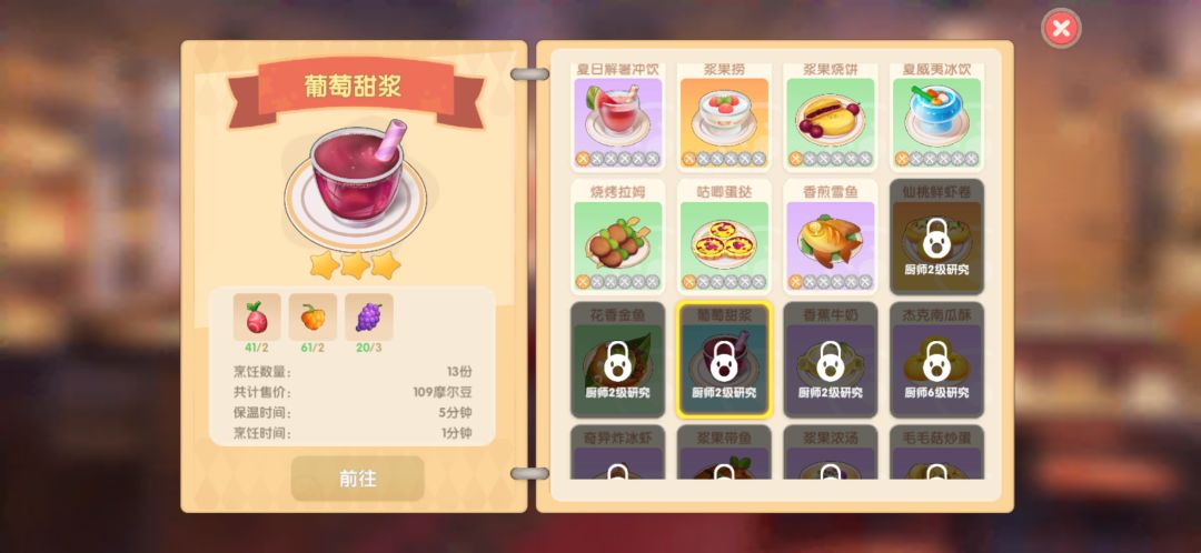 如图所示哈,葡萄甜浆需要这些材料,我材料都有,等级也够了,为啥研究菜谱的时候,不显示我已有的材料呢…