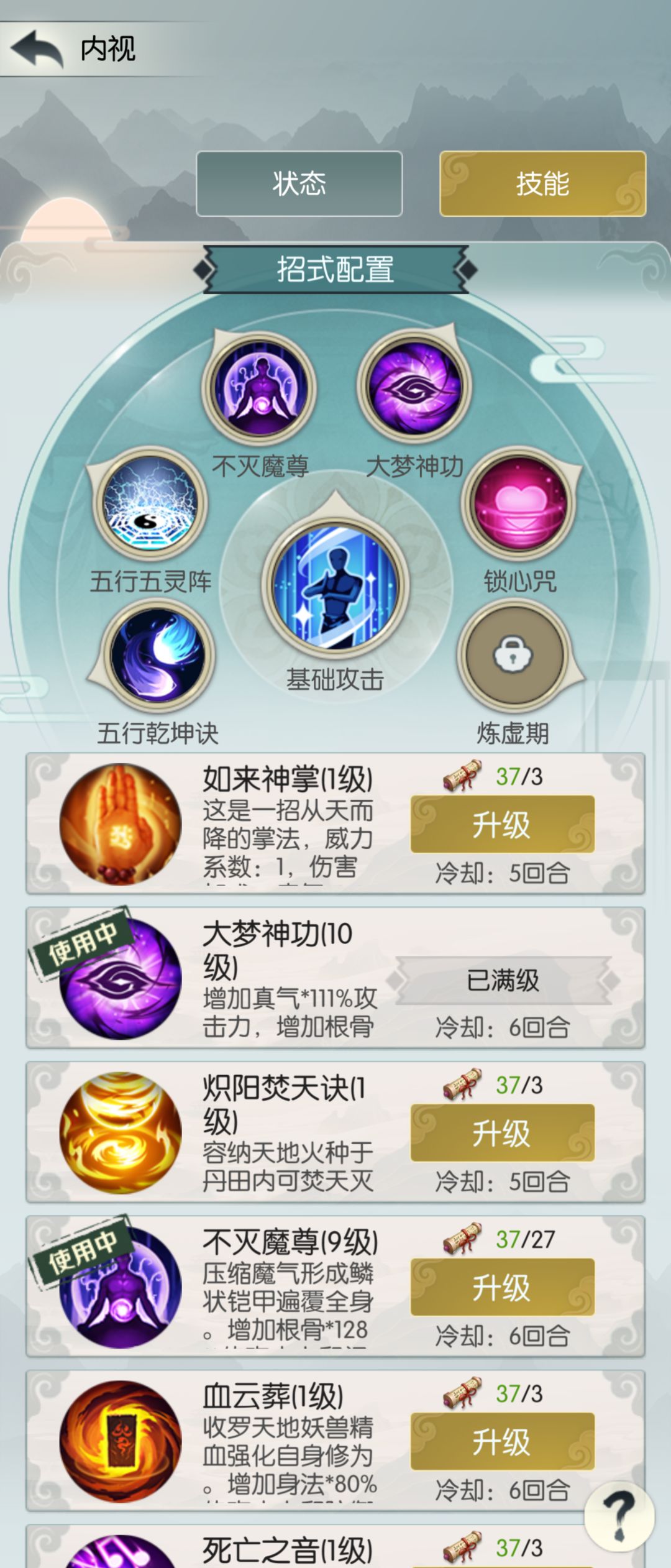 大梦神功:开场就能买到的技能,前期优先升级,CD6回合,实际生效4回合,有2回合空档期