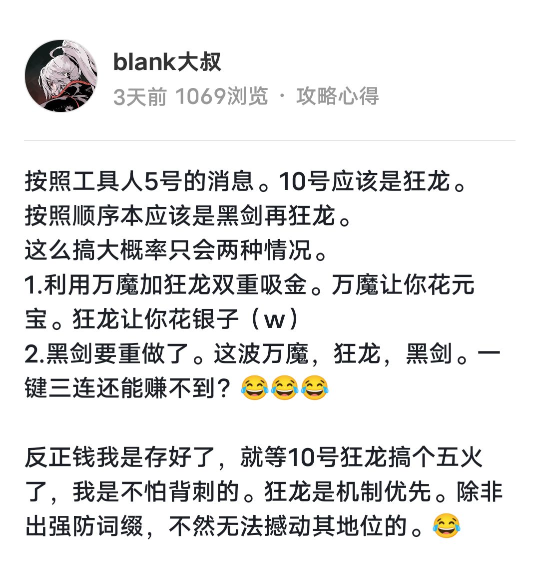 3.有关新心法玄玉,我感觉心大的直接可以***狂龙不会亏,心细的可以每天10连等下周新心法出来我给个测评再***。这个随你。