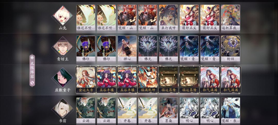 注意尽量不要让式神出击,靠座敷童子形态牌和青坊主书翁打配合,保持血量迅速过牌。山兔前期并不重要,只需注意升到二勾挂上觉醒。书翁用明心和云游保证三勾前手里有一张萌即正义即可。