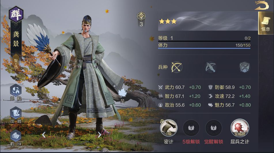 对敌军单体武将造成65%智力伤害,技能冷却20秒。