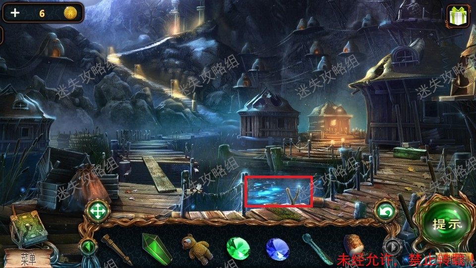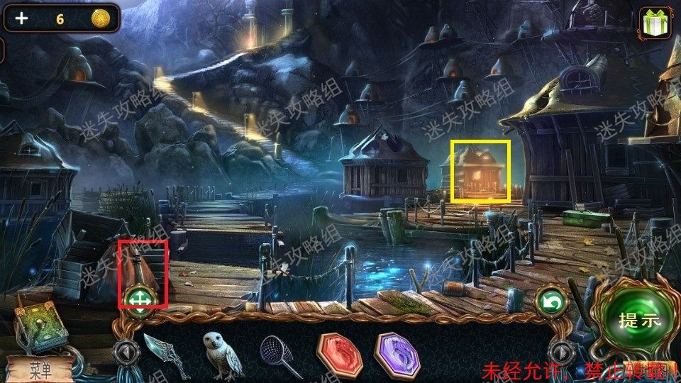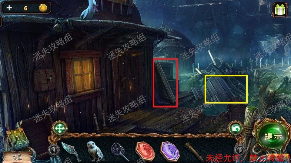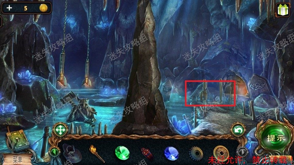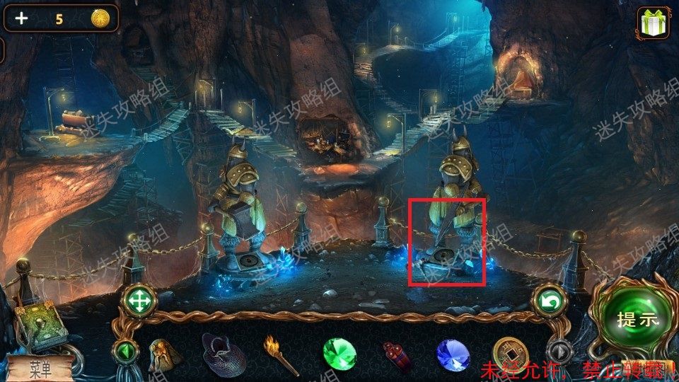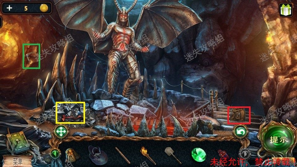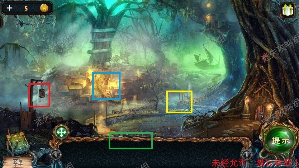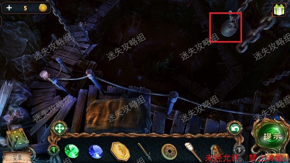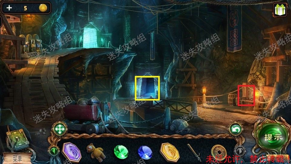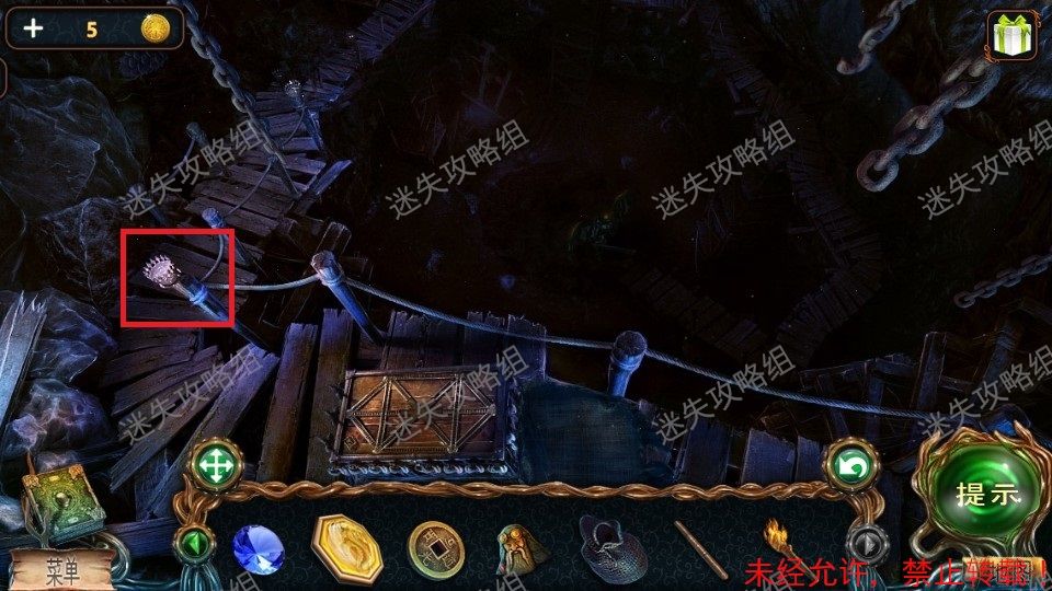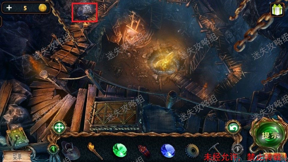 51、前往栈道对红圈处直接使用火把,整个地图被点亮。(图片使用的是点亮后的地图)。黄圈处点击放大,得到铁铲、绿宝石(2)。绿圈处点击,进入小游戏。51