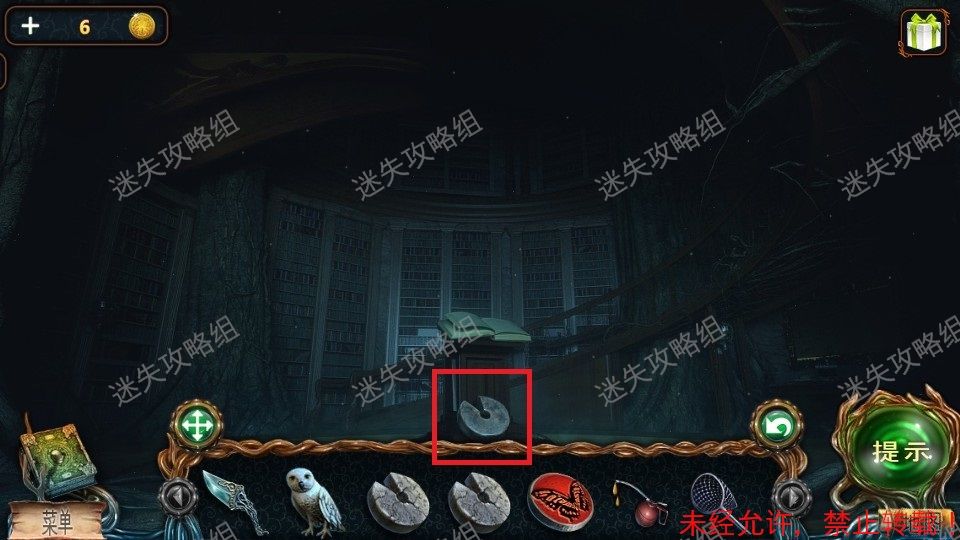 43、进入图书馆。红圈处点击放大,得到铜钱(1)。黄圈点击放大,对图使用匕首,得到里面的鱼雕像。43