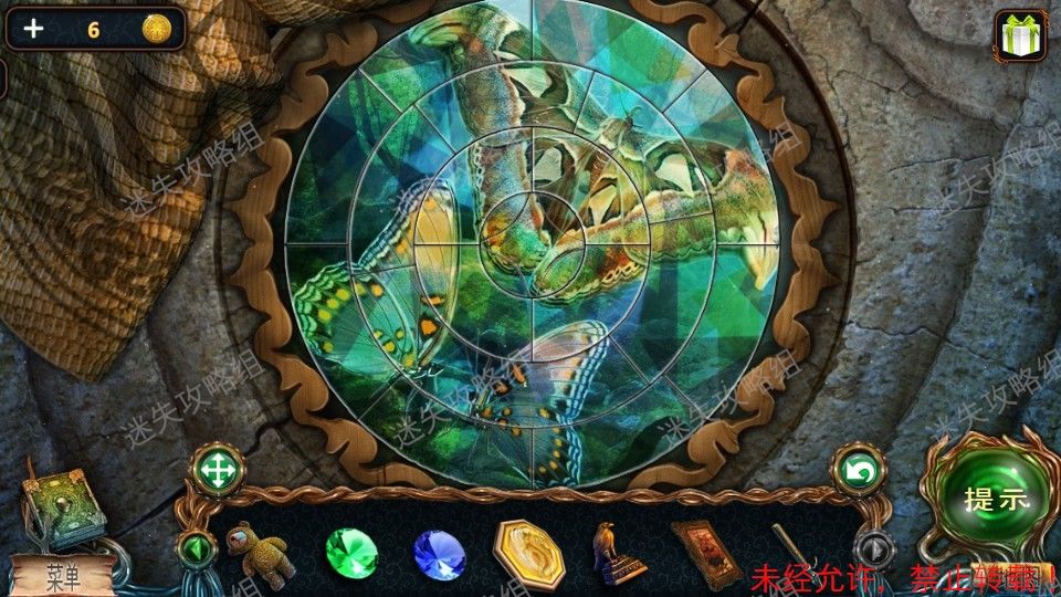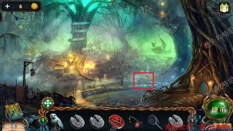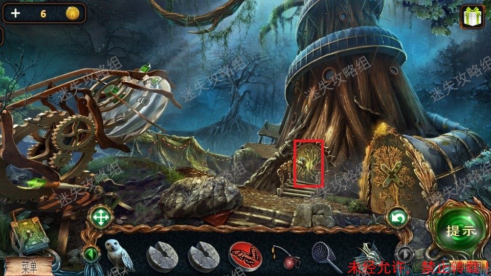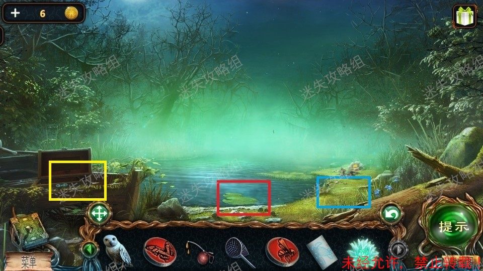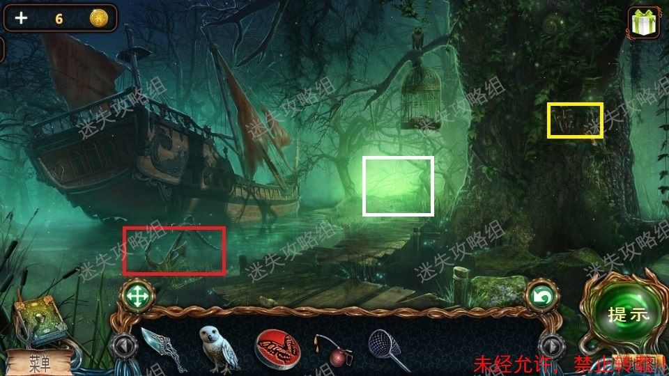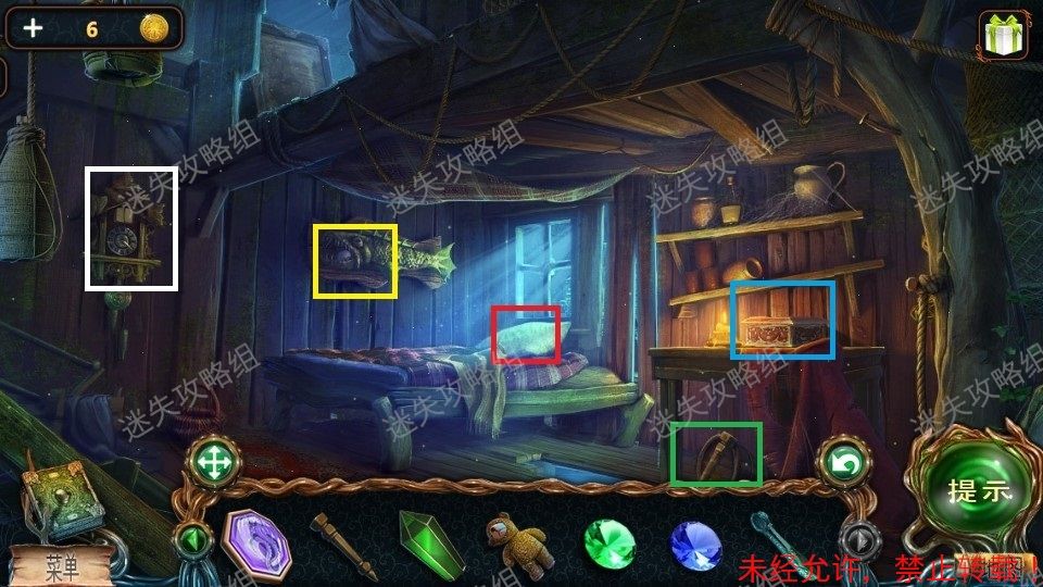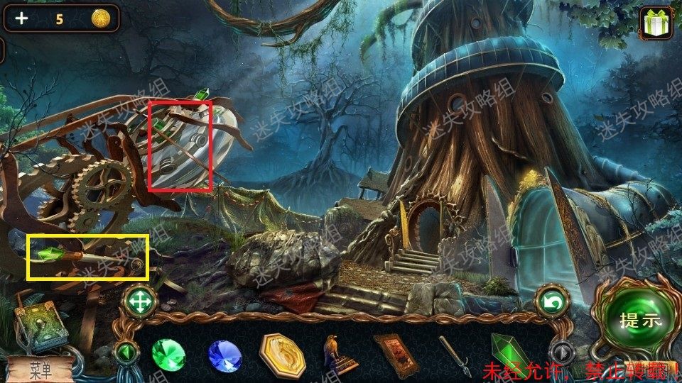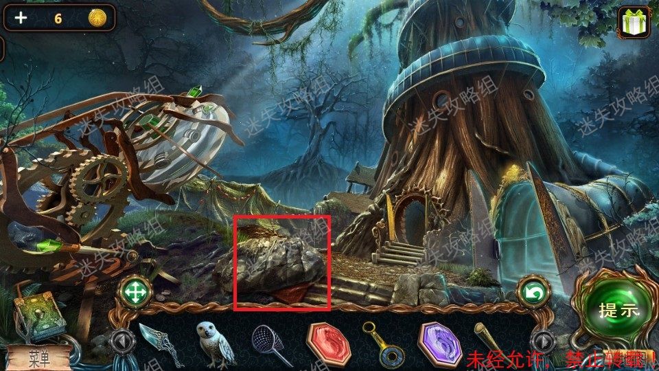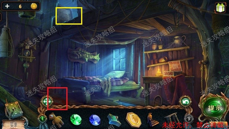 33、红圈处点击得到泰迪熊和绿宝石(1)。黄圈处点击放大后,对石头上的宝石使用猫头鹰,得到蓝宝石(2)。篮圈处点击放大,得到面包屑和钳子。33