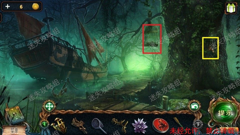 17、下图红圈处直接用船桨对其使用,打下鸟笼后点击掉落在地上的鸟笼,得到空瓶,星座图。黄圈处点击放大后,对右边凝固树脂使用匕首,将凝固树脂撬开,开始滴落树脂后使用空瓶得到一瓶树脂(用来召唤河神的材料6)。17