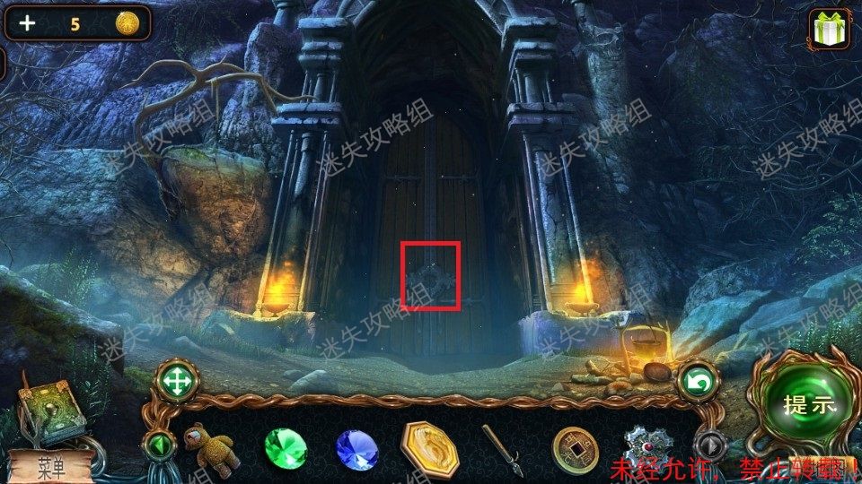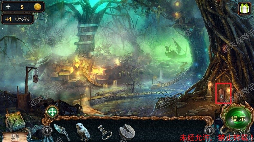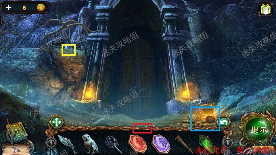 5、红圈处直接使用猫头鹰让猫头鹰把东西拿下来,得到门环。黄圈点击后的地上左下角得到砝码(1)。退回到之前的场景。5