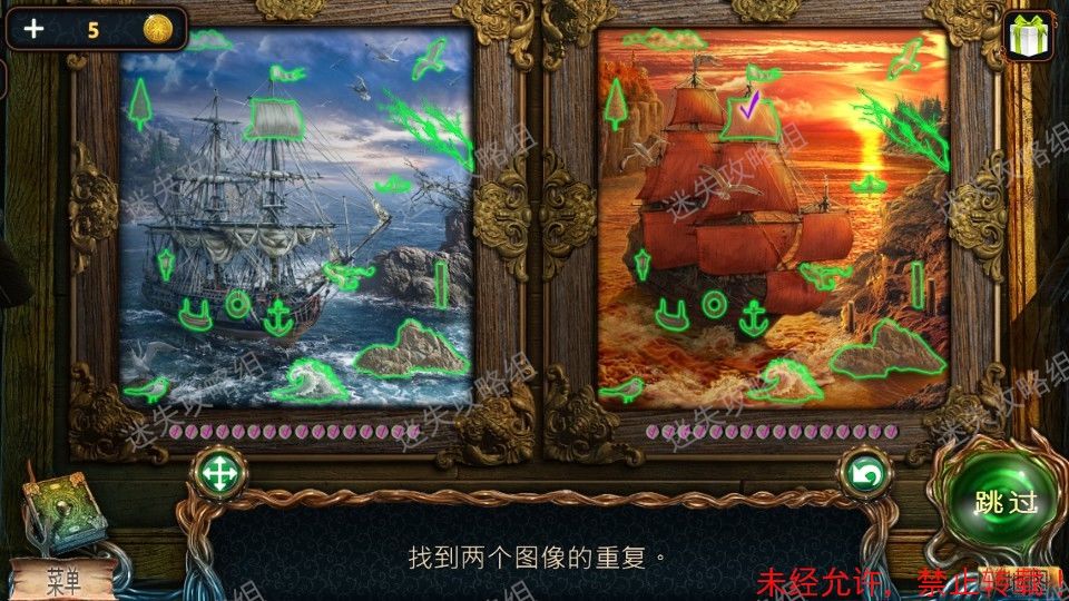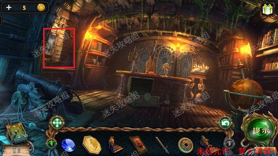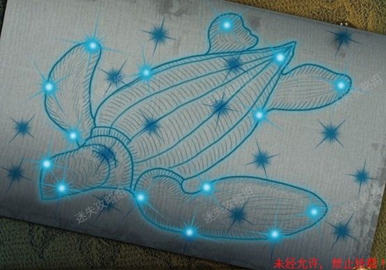 44、船长室下图红圈处点击放大,在画的右边空白墙面上放上之前得到的画。小游戏(解法如图)。完成后得到鹿雕像。44、1