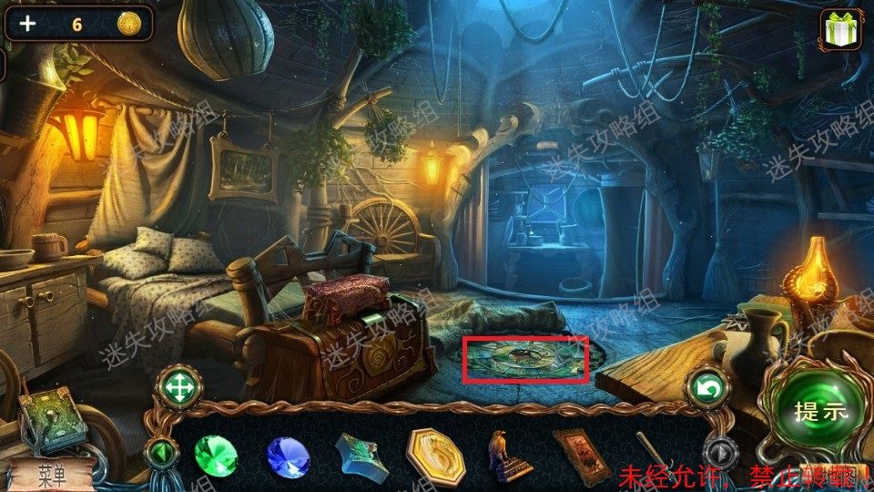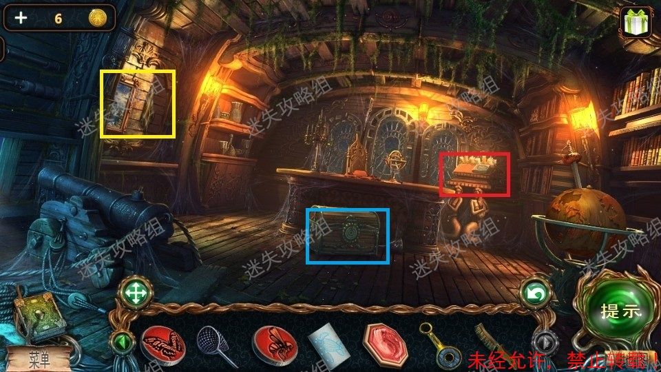 22、红圈处点击放大,点击书,对放大后的封面使用星座图。点亮对应的星星,完成游戏后点击书面得到红色图章(3)。黄圈处点击,画右侧的布点击掉落后看见绿色轮子图像,点击确认线索。篮圈处点击放大后点击得到紫色盘(2)。22