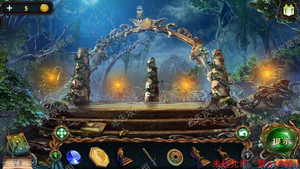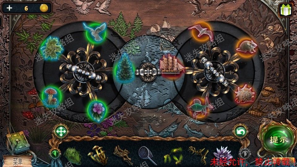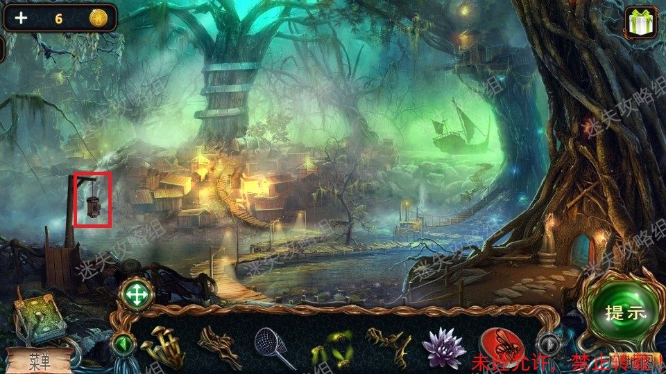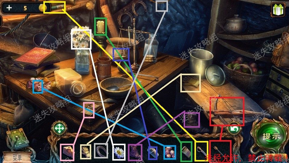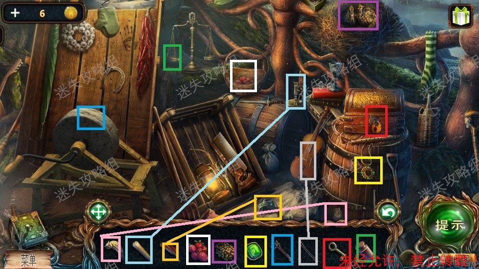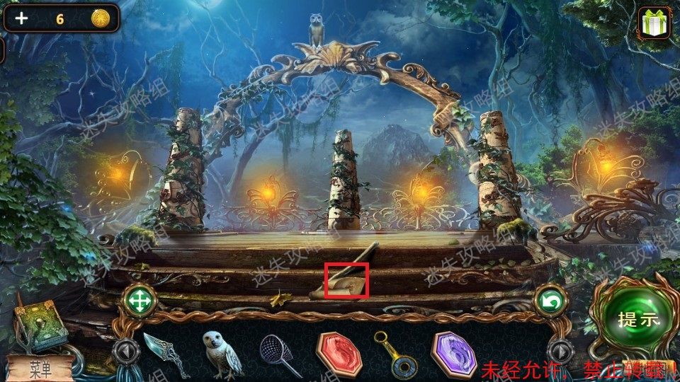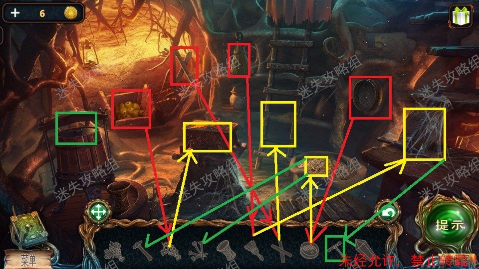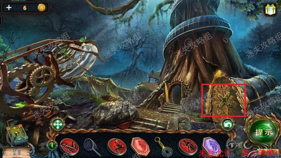 15、回到森林入口,红圈处点击放大后放入萤火虫。然后点击下方被照亮的区域,进入小游戏。(小游戏为下方栏内各物品对画面中对应位置使用,解法如图)。完成小游戏后得到羊角锤。15、1